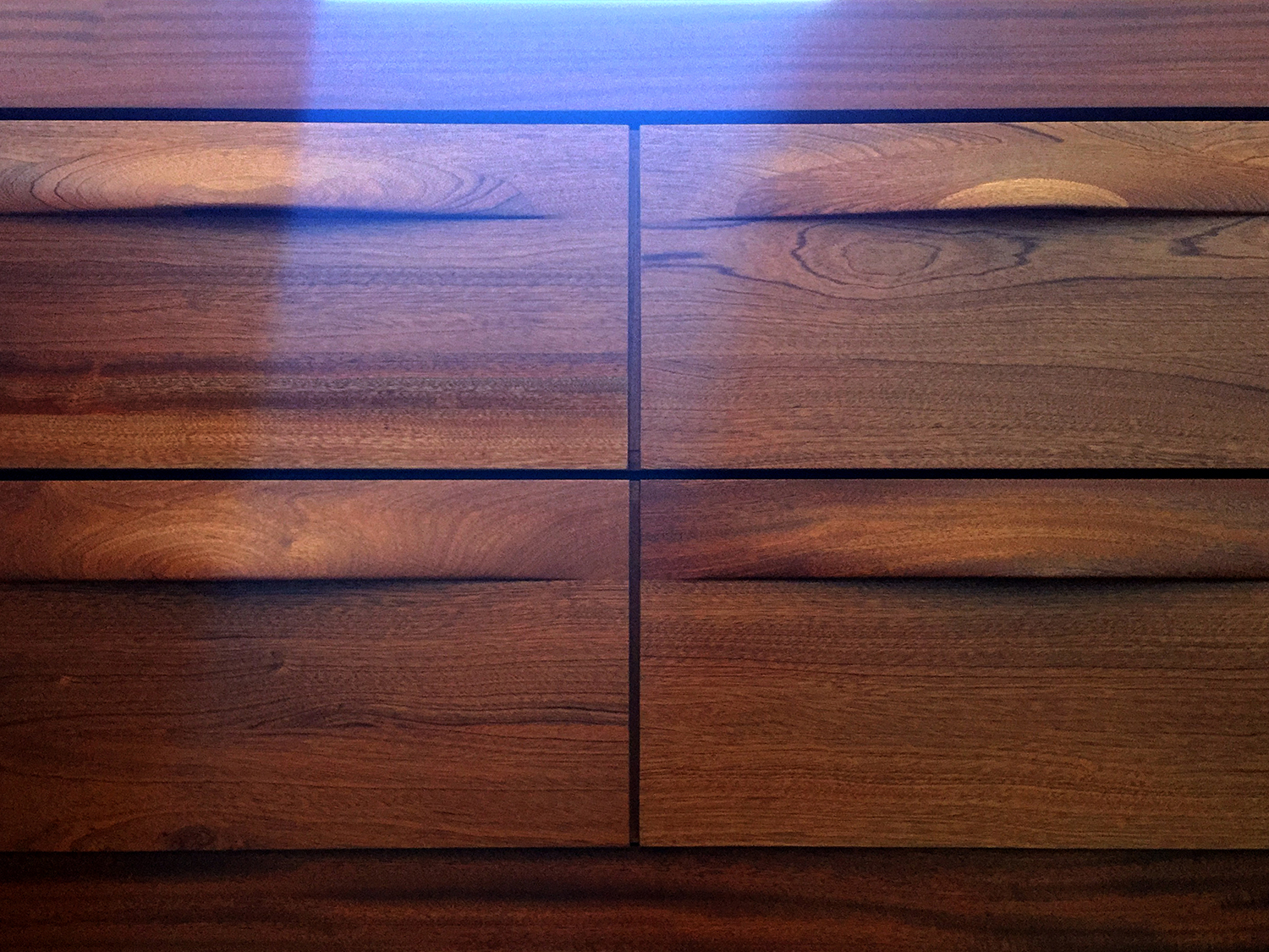 Edle Hölzer wie Nussbaum, Mahagoni, Ebenholz und Teak werden handverleimt. Da dünnes Holz in einer Richtung leicht bricht, verleimen wir die Fasern in leichtem Winkel zueinander und die Mittellage aus kontrastierendem Holz rechtwinklig. Das sorgt für maximale Stabilität, auch die Verwindung während des Trocknen des Holzes bleibt minimal.